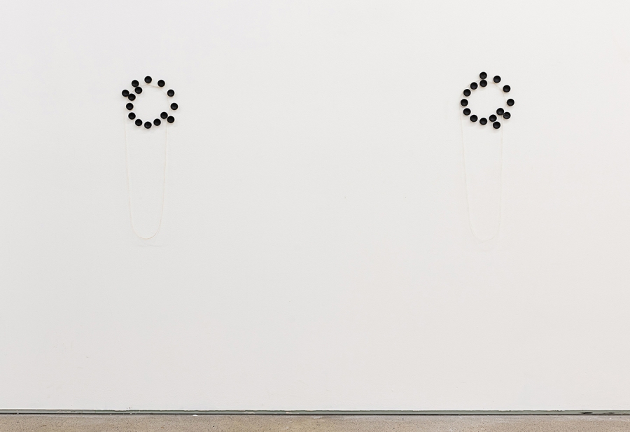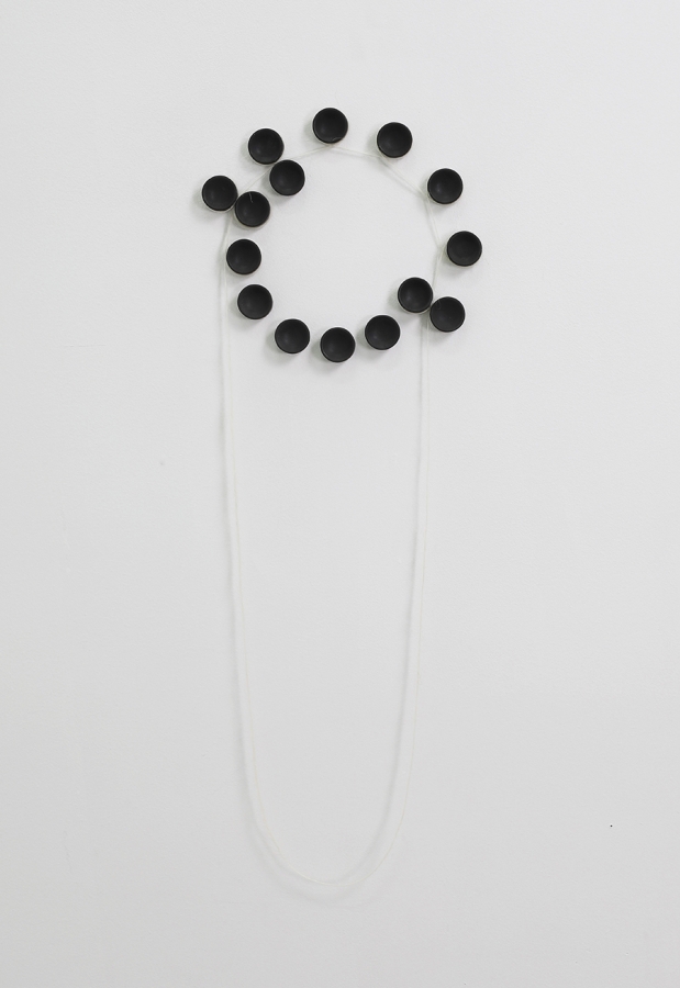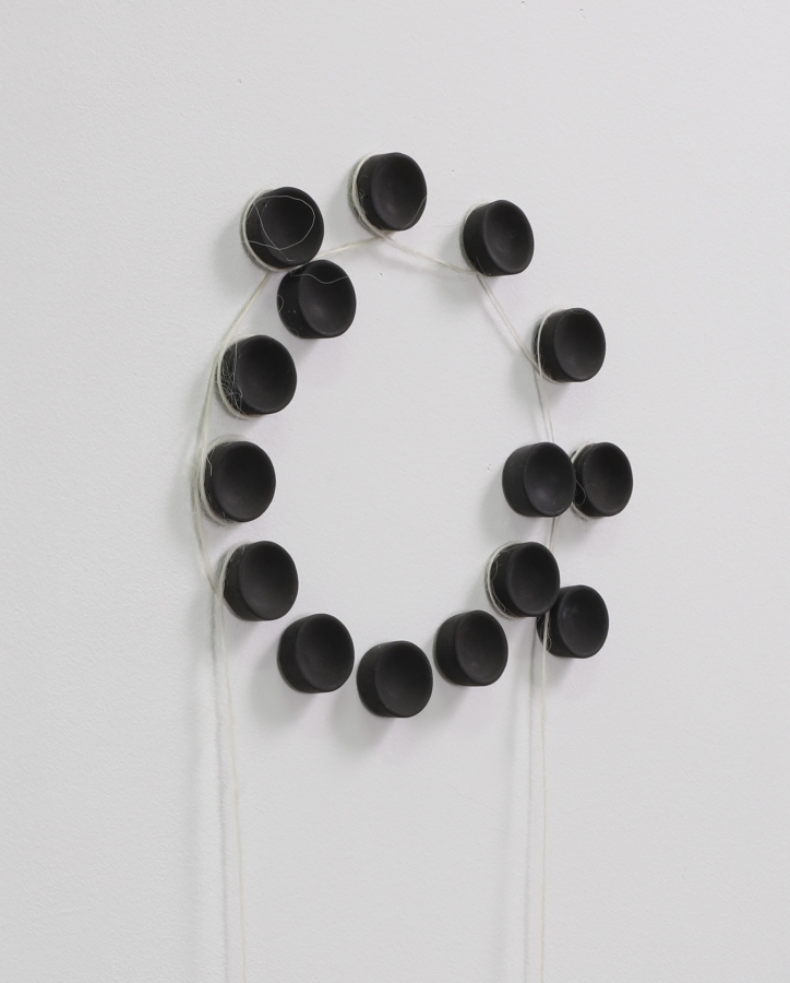 ‘tiffanie’s clock’, 2023; charcoal, cement, continuous loop of wool fiber; 8 × 24 × .25 inches
